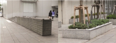 これまであまり気に留めていなかったけれど、けやき通りにある花壇やベンチ、ビルの案内板などの一つひとつをチェックしてみると、あちこちに「ここでスケボー、やってたよね?」という傷を発見する。これでは突起をつけるなどの対策を取らざるを得ないだろう。