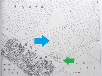 空き地(青い矢印)、山手警察署(緑の矢印)(『昭和45年中区明細地図』)