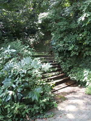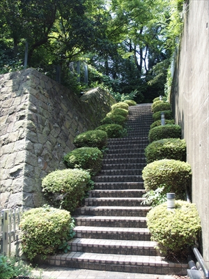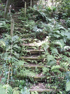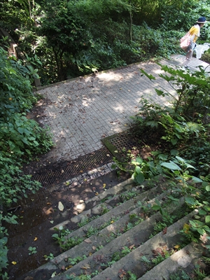 今回は、監視カメラを気にせず堂々と柵の中に入り、タイル張りのきれいな階段を30段ほど上ると、方向が変わり、今度は古びた石段が上へと続いている。