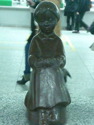 赤い靴といえば、横浜。「あかいくつ」ってバスも走っているし、赤い靴モチーフのお土産も売っている。横浜駅の待ち合わせ場所にも像があるし、山下公園には海を見つめる像がある。