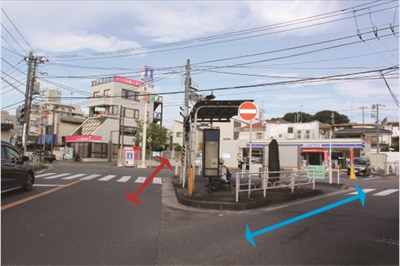 写真中央のバス停の所に「道路碑」があり、青い矢印が菅田道路で、赤い矢印が、三沢小机線。三沢小机線は1931(昭和6)年に横浜市が失業対策として行った公共事業で作られたそうである。