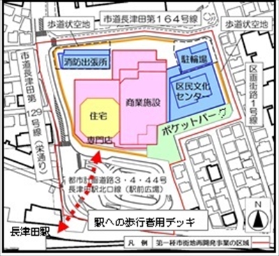 「約2.2ヘクタール(2万2000平方メートル)を、長津田マークタウン(住宅・店舗複合タワーマンション、商業施設、区民文化センター)、消防出張所、公共駐輪場、駅前広場、道路の整備を行っている」とある。