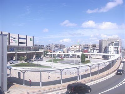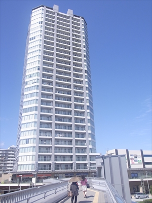 その歩行者デッキを歩いていくと、長く続くデッキと広々としたバスロータリー、そして堂々たる高層マンションの姿が、印象的だ。