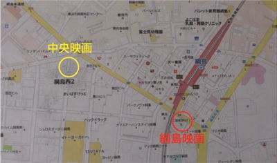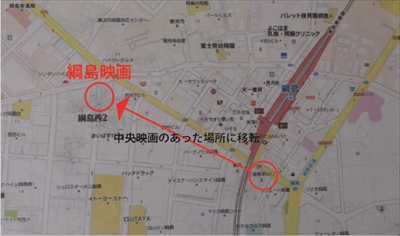 黄色の丸が「中央映画」、赤丸のところが40年くらい前の「綱島映画」