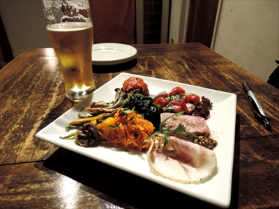 ボリュームも満足で目にも鮮やかな前菜の盛り合わせ。ハートランドの生(540円)と一緒にいただいた。