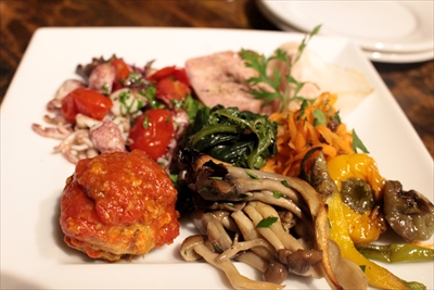 手前から時計回りに、鰯のポルペット(肉団子)、ヒイカの釜焼き、隣がパテ・ド・カンパーニュ(田舎風パテ)、自家製のポルケッタ、ニンジンのラペ・クミンシード風味、ほうれん草のアーリオーリオ、キノコのマリネ、温野菜のグリルマリネ。