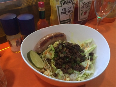 思い描いていたカレーと違う。ご飯の上に細かくザク切りにしたキャベツ、ミンチとタマネギなどをカレー風味に炒めてのせた、一見ドライカレーのよう。なんでもオーナーのお母さまがハワイに住んでいたころ、いつも作ってくれたカレーだとか。