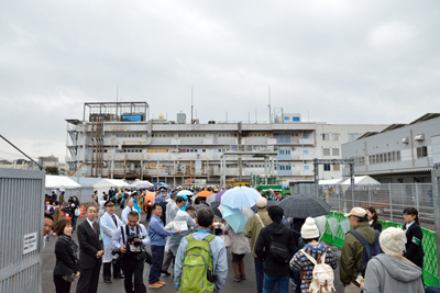 昨年の会場だった新羽車両基地と違い、屋根のない場所が多かった川和車両基地。雨の影響をもろに受け、中止になったり急遽会場を変更したイベントや演目もあったが、お客さんの出足は悪くなく、会場のいろいろな場所に人だかりができていた。
