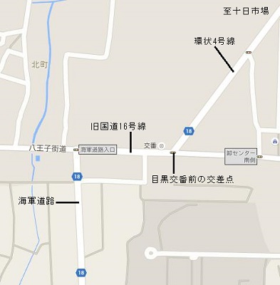 海軍道路は横浜市の環状4号線の一部。ところが、十日市場方面から環状4号線を走ってくると、目黒交番前の交差点で丁字路になっている。その先は、いったん市道五貫目第33号線(旧国道16号)に入って200メートルほど先の海軍道路入口を左折して進むようになっている。そのためこのあたりはいつも車が渋滞している。