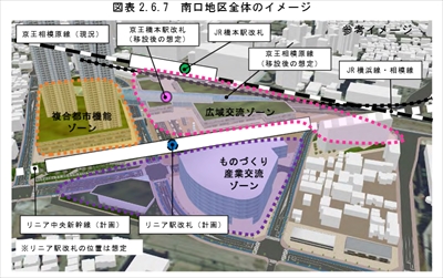 それによると、同駅南口地区を「広域交流」「複合都市機能」「ものづくり産業交流」の3つにゾーニングする。また、京王相模原線橋本駅の移設も想定している。
