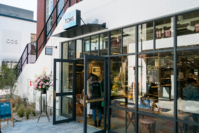 そのまた隣にある「TOMS(トムス)」は、カリフォルニア州サンタモニカで設立されたショップ。ここは、”One for One”という企業理念に基づいた経営をしている。靴が1足売れるごとに、発展途上国に住む靴を必要としている子どもに1足の靴を届けている。それが”One for One”。