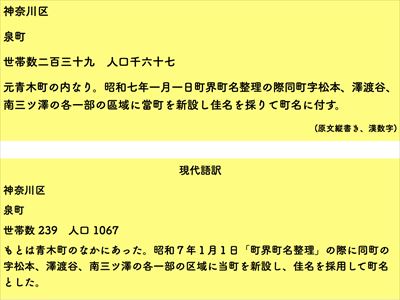 「泉区」に「和泉町」があって「神奈川区」に「泉町」があるというのは、なるほどむずかしい問題である。