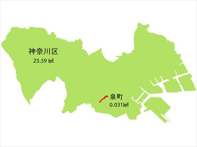 神奈川区と泉区は23.59平方kmと23.56平方kmとほとんど同じだが、泉区和泉町の6.414平方kmと比べると神奈川区泉町は0.031平方kmととてもこぢんまりとしている。