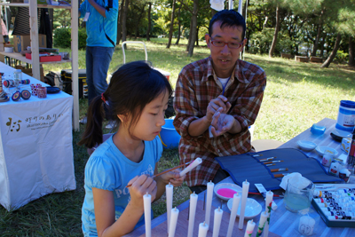 のぞき込むと、和ろうそくの絵付け体験をやっている。