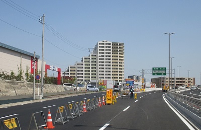 246号線の上を通るベージュ色の高架が開通部分