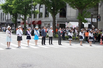 主催者の両脇に開港五都市のミスや親善大使がそろう