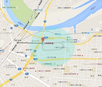 京急川崎駅と川崎競馬場は直線距離で約600メートル。そこで今回はその半分にあたる約300メートル以内を“川崎競馬場周辺”とする。