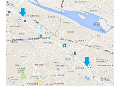 川崎市菅地区の境目(青矢印)とその間に地蔵が立っている(Googlemapより)※クリックして拡大