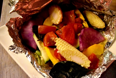 (6) 鎌倉野菜のオイル蒸し:素材の味を楽しむために塩味は控えめにして白ワインを効かせた野菜たちを、ホイルごと七輪に乗せて湯気が出てきたら火から外して1~2分蒸らしたら食べごろ