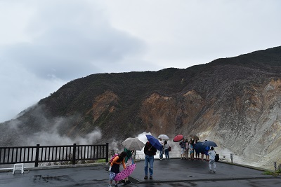 規制解除と同時に雨の中、大涌谷園地に足を踏み入れる観光客