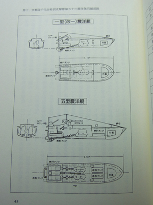 『日本特攻艇戦史』によると「震洋は長さ5メートルあまりのベニヤ板張りのモーターボート。これに爆弾をつけて体当たりするという。1944(昭和19)年の秋には前線に配備されている。1944(昭和19)年〜1945(昭和20)年、敵の上陸を防ぐには特攻艇と人間魚雷しかなかったのである。神奈川県では日本造船鶴見工場や山下工場で作られていた」とある。