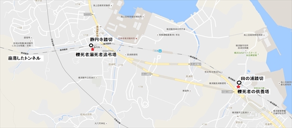 田浦駅を中心に東京寄りの踏切に関東大震災の際、トンネルの崩落事故で無くなった方を祀る供養塔があったが、安針塚の塔の詳細は不明