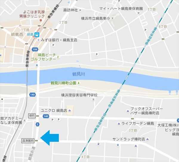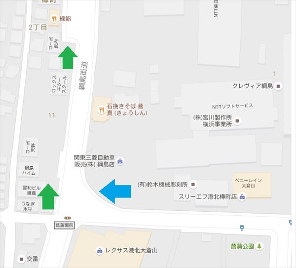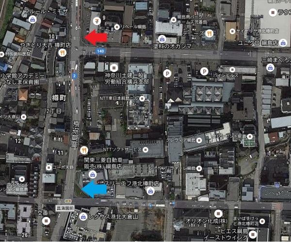 菖蒲園前交差点(青矢印)と樽町交差点(赤矢印)(Googlemapより)