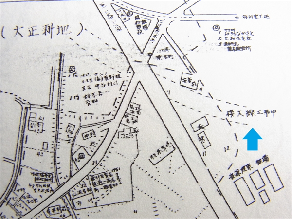 工事中のJR根岸線(青矢印)(昭和44年磯子区明細地図)