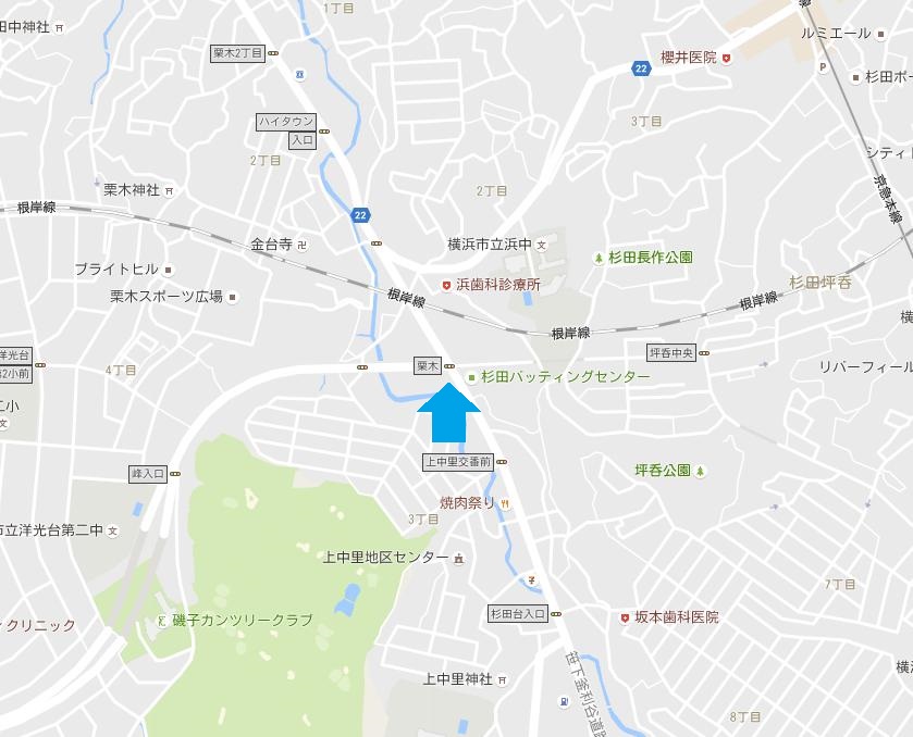 投稿にあったとおり、現在栗木の交差点がある場所は、都筑区佐江戸町と磯子区杉田5丁目を結ぶ環状3号線とJR根岸線が東西に貫き、金沢区や磯子区西部の住宅地から上大岡方面へ南北に通る、笹下釜利谷道路が交差している。