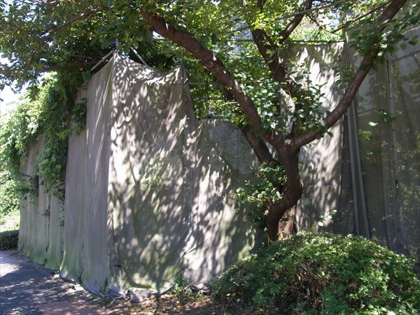 その壁の周囲には、シートや立ち入り禁止の看板などがあり、中に入れないようになっている。