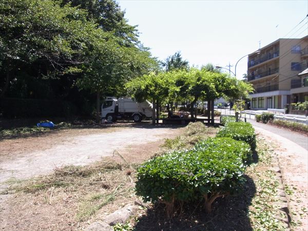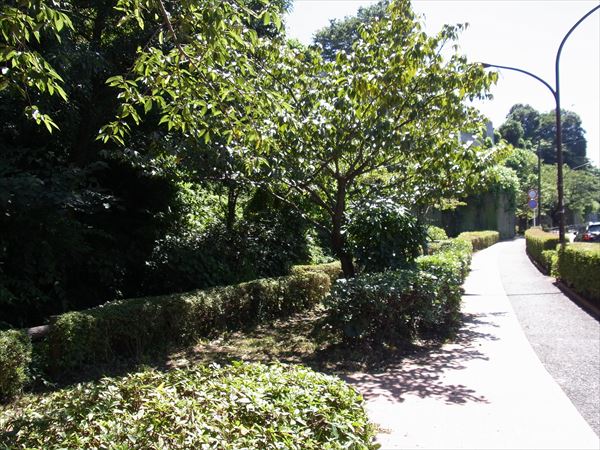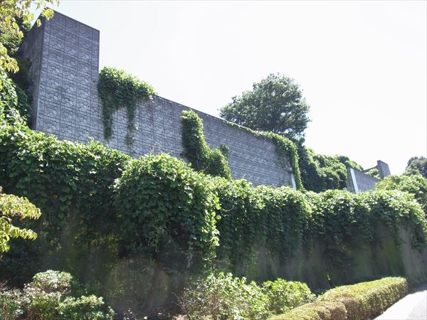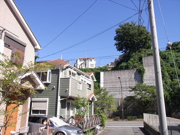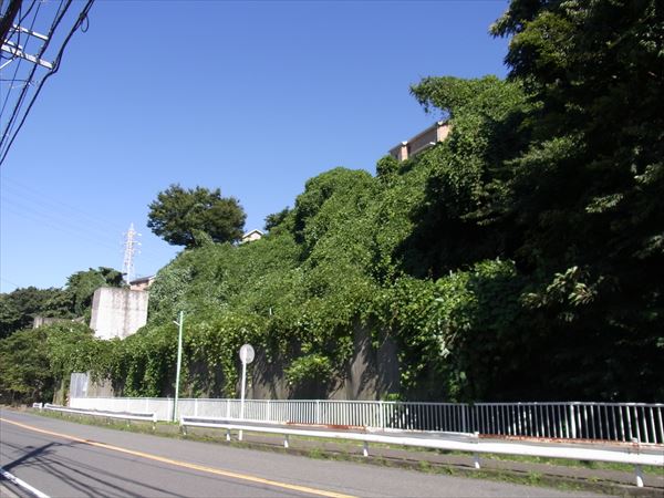 先ほどの外壁の正面には道路が通っていて、反対側には住居が並んでいる。また住宅地に囲まれているからか人通りは少なくなく、近くの小学校の通学路にもなっているようだ。山を切り崩した傾斜地に長年建っているようだが、大雨の日などに危険性はないのだろうか。