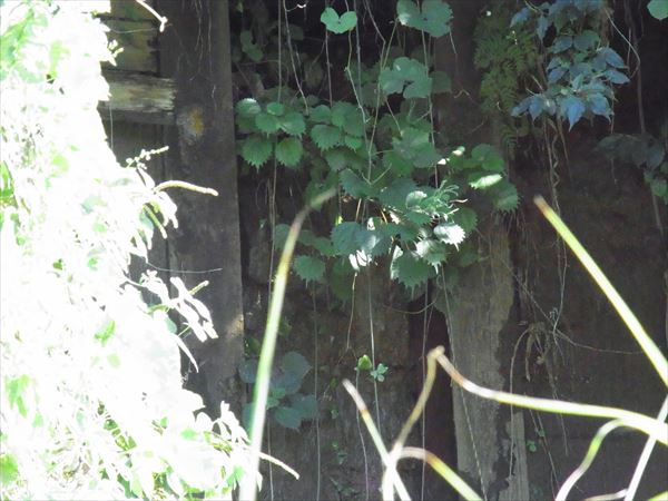 その散策路を進むと、山際に幅数10メートルに及ぶ城壁のような壁が続く。長年放置されていたせいか、雑草に覆われている。