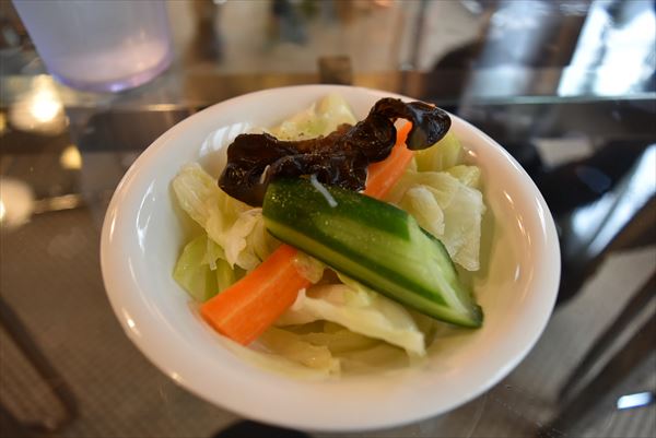 サラダは、見た目が鮮やかで、塩コショウ中心のドレッシングがかかっている。ぶつ切りの野菜とキクラゲの食感もいい。ザ・シンプルサラダ。