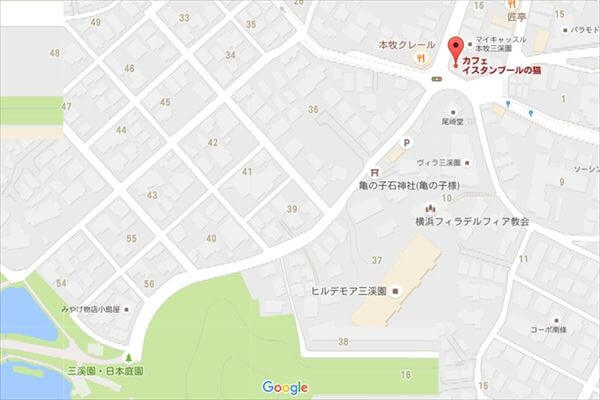 場所はこの辺り。横浜市営バス各系統「三溪園入口前」より徒歩1分
