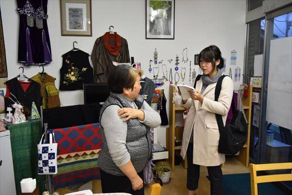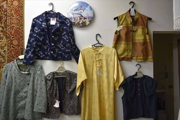 「処分に困った着物をリメイクして服を作って売っているの。母親が仕立屋をやっていたので、昔から着物は大好き。リンネやメルカリ(手作りのアイテムを売買できるサイト)でも販売しているのよ」と、美樹子さんとご友人の作品だった。