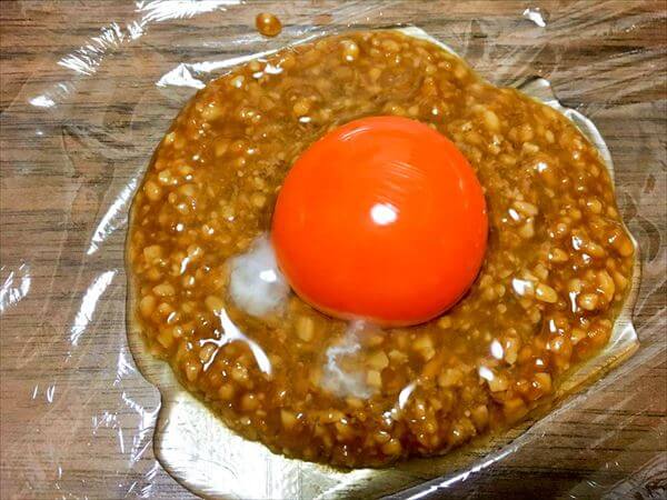 ラップに醤油麹と卵黄を落とす