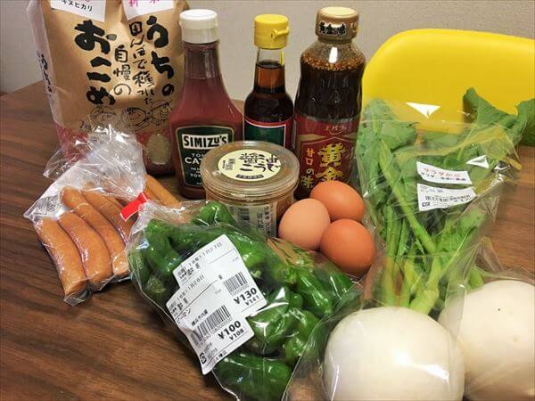 「サラダカブ(141円)」、「ピーマン(108円)」、「金岩井純正胡麻油金口(380円)」、「横浜清水屋有機トマトケチャップ(442円)」、「川口糀店の醤油こうじ(500円)」、「エバラ黄金のたれ甘口(321円)」、「箕輪養鶏場の卵(300円/8個入)」、「やまゆりポーク(701円)」、「スモークハウスよこはまのチョリソー(500円)」、「新米キヌヒカリ」(1026円/2kg)だ。