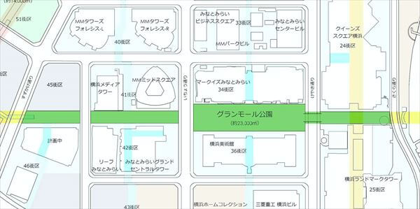 グランモール公園とは、みなとみらい二~四丁目にある総面積約2万3000平方メートル、下図のように、すずかけ通りとさくら通りの約700メートルを結ぶ非常に長い公園である。