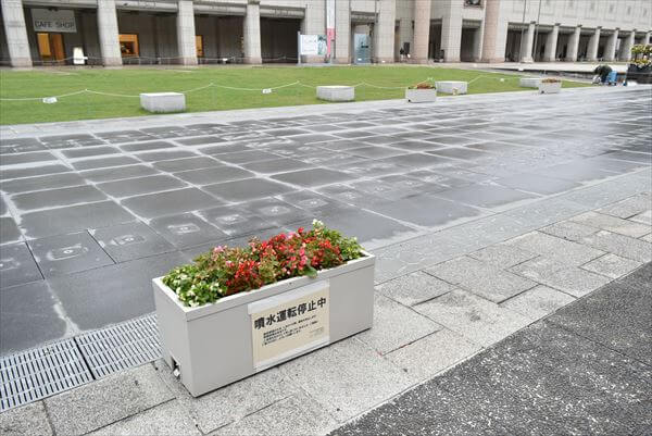 「噴水運転停止中」という張り紙がプランターに貼られていた