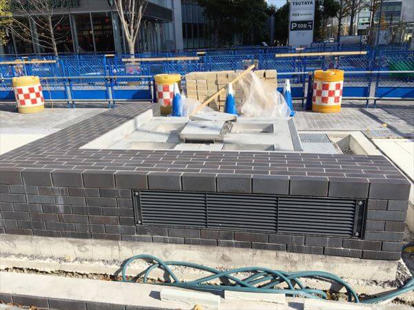 ベンチなどが作られ、滞在性のある憩いの場となる。スプレーで書かれていた国名はベンチのレンガの積み方。噴水は2016年秋には稼働を再開した。