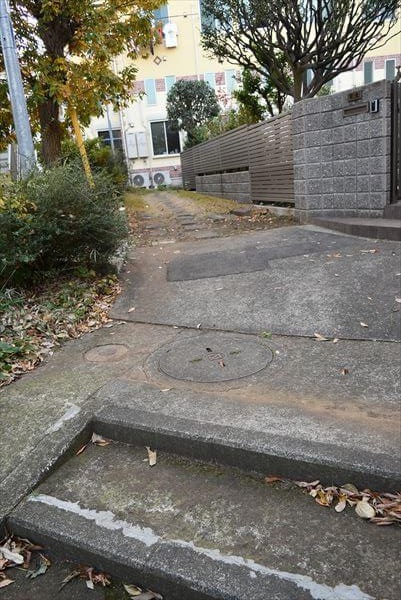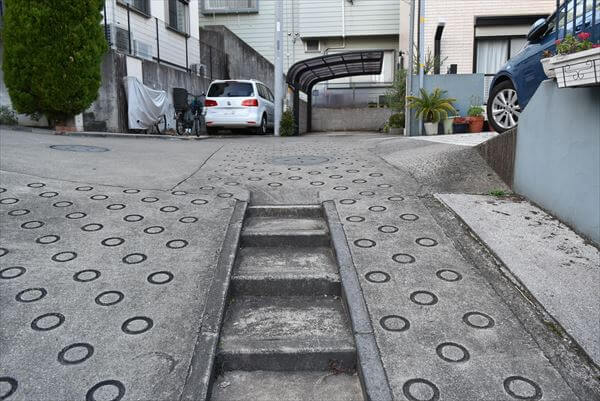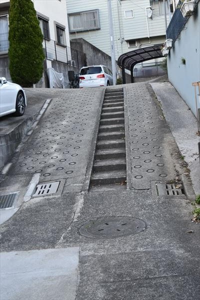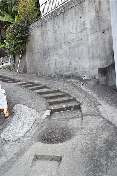 確かに車が通れるようだ。探していた場所はここなのか? しかし、「車が通れる階段」であるのは間違いないが、住宅への取り付け道路というべきもので、通り抜けることはできない。