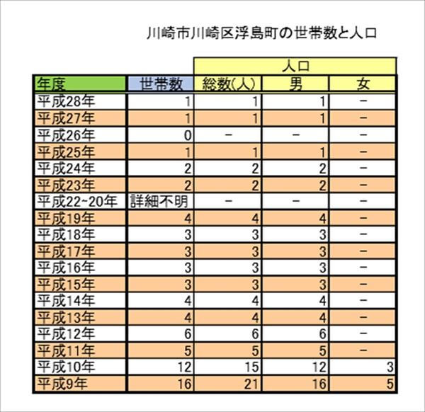 そのほかにも川崎市のHPに、1997(平成9)年度までの世帯数と人口を公開しているページがあったので閲覧した。すると、浮島町の人口は1997(平成9)年~2016(平成28)年度の間で、大分変動していることが分かった。