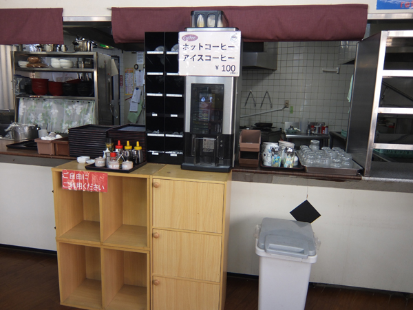店内は約20席ほどでこぢんまりとしているが、大きな窓からは一般道の川沿いの道と住宅が見えて、このローカル感が心地良い。食事は券売機で食券を購入し、奥のカウンターで受け渡しする。
