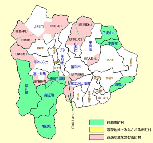 山梨県過疎市町村マップ(山梨県全国過疎地域自立促進連盟公式サイトより)