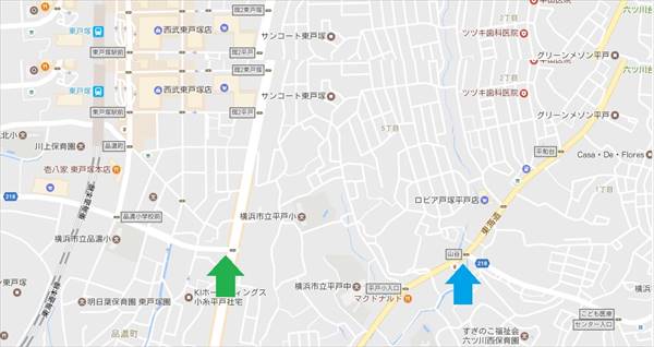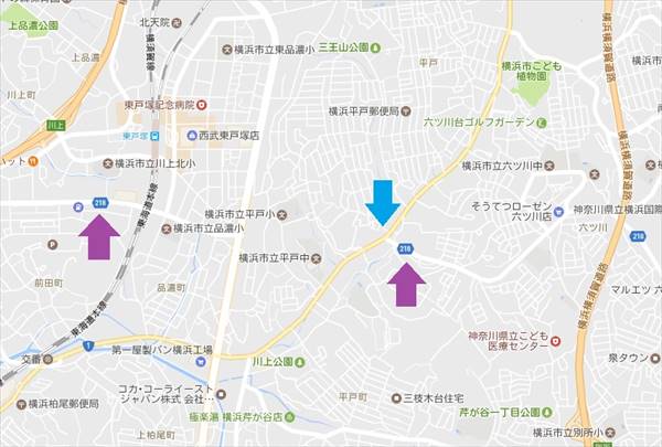 山谷交差点(青矢印)と平戸桜木道路(紫矢印)(Googlemapより)