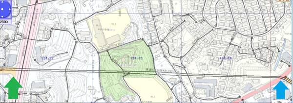 山谷交差点(青矢印)と環状2号線(緑矢印)が合流する予定だ(行政地図情報提供システム)