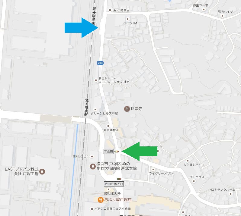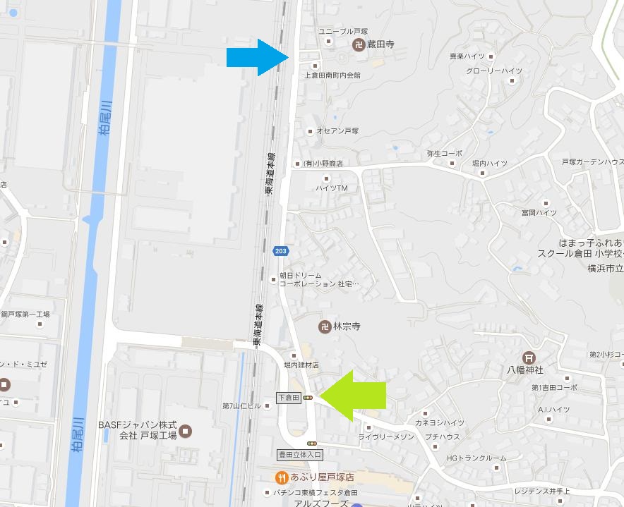 上倉田南バス停(青矢印)と下倉田交差点(緑矢印)(Googlemapより)