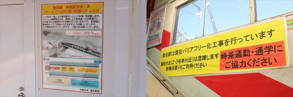 ホームや階段にはリニューアル工事を知らせる案内板が貼ってある