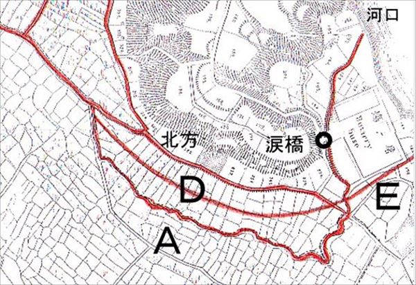「この図のAが江戸時代から明治にかけての流れです。Aから涙橋(なみだばし)を通って河口に流れ出ていたのです。それが明治の終わりに流れをD、Eに変えるような掘削工事が行われました」