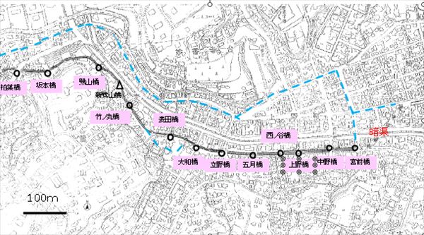 改修の範囲は河口の北方町小港から根岸町(現在は中区)柏葉まで、2454.5メートルに及ぶ大工事であったことが『横浜復興誌』には記されている。